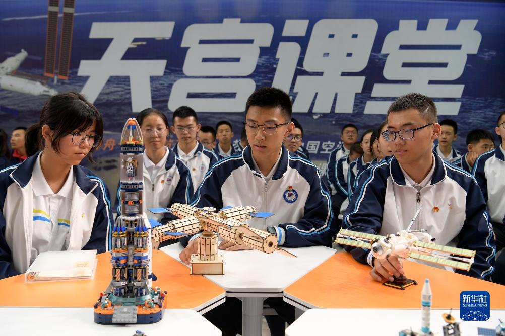 9月21日,在陜西延安科技館“天宮課堂”第四課地面課堂,學生在了解航天模型。