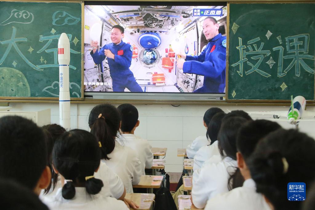 9月21日,在山東省高密市文昌中學,學生收看“天宮課堂”第四課。