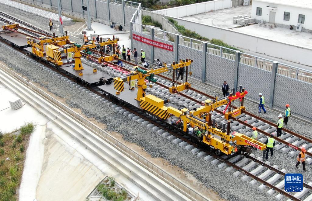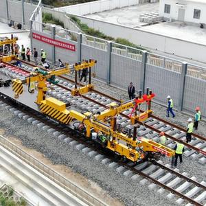 9月21日,中鐵一局建設者采用我國自主研發的新型智能本鄰兩線鋪軌機組進行鋪軌作業,該機組可實現跨線鋪軌,使高鐵線路軌道鋪設更加高效(無人機照片)。