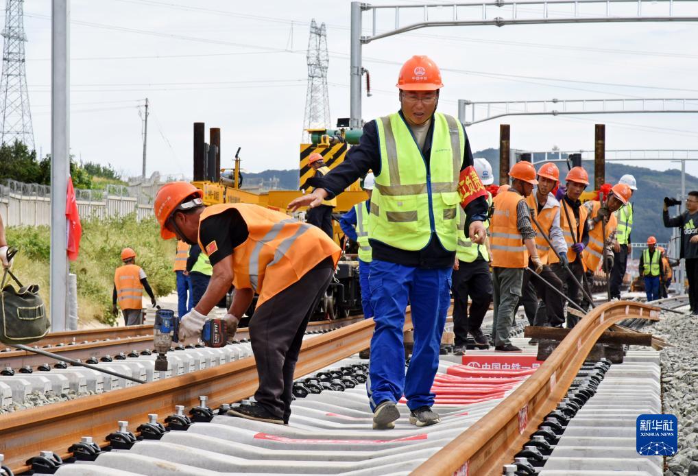 9月21日,中鐵一局建設者在煙臺芝罘站外鋪設鋼軌。