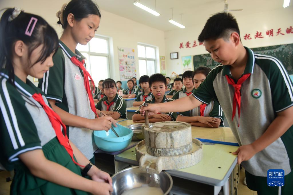 9月21日,滄州市新華區榮官屯小學的小學生在研磨豆漿。
