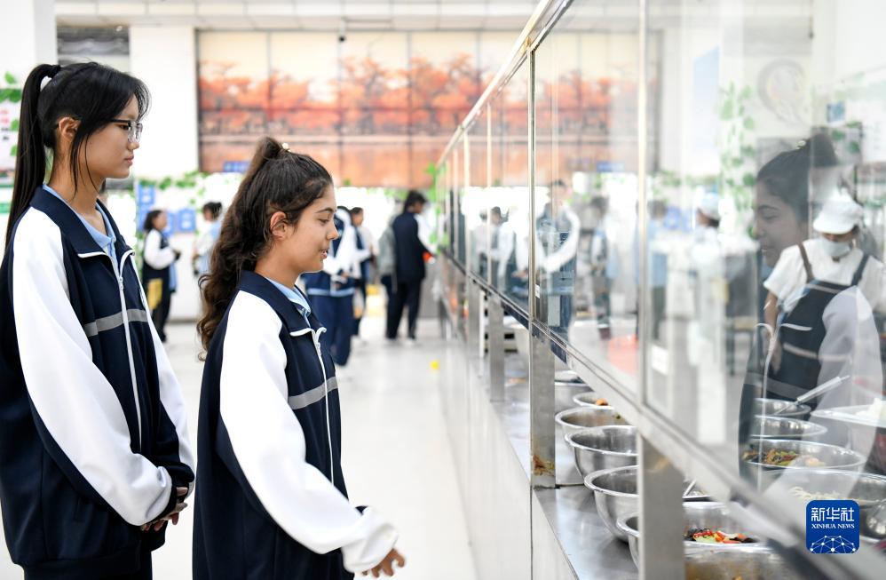 在新疆喀什第二中學,高二學生都爾汗·拉齊尼(右)在食堂等待打飯(9月7日攝)。