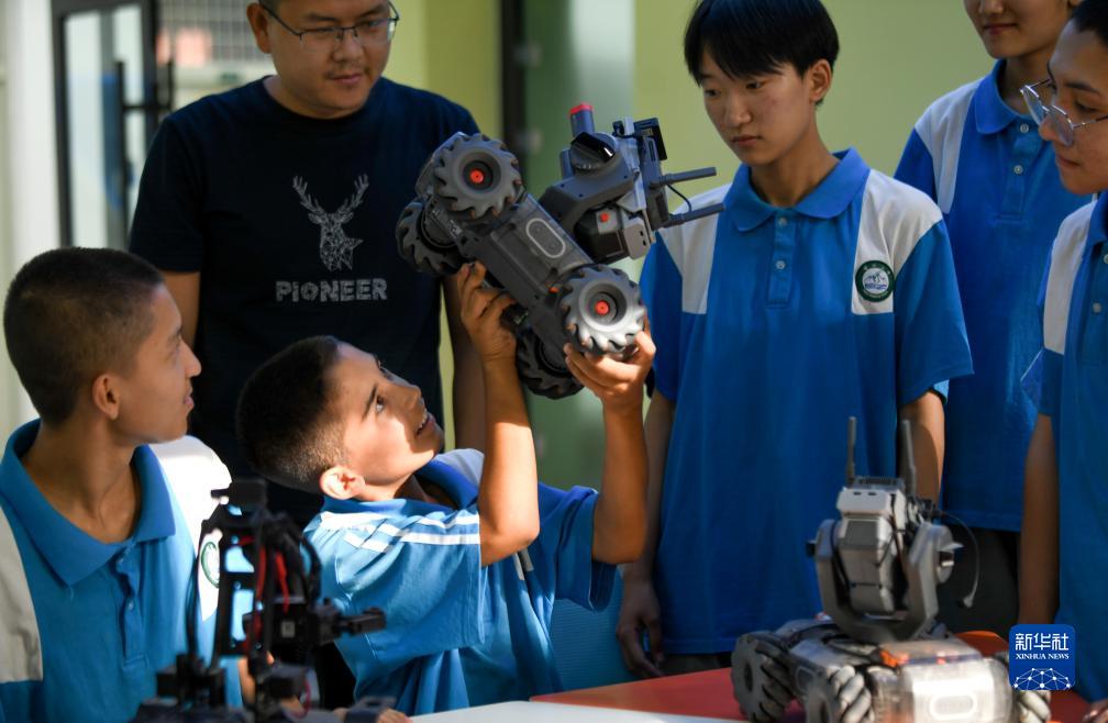 在新疆喀什第二中學,教師程應超(后)指導九年級的同學們學習機器人知識(9月7日攝)。