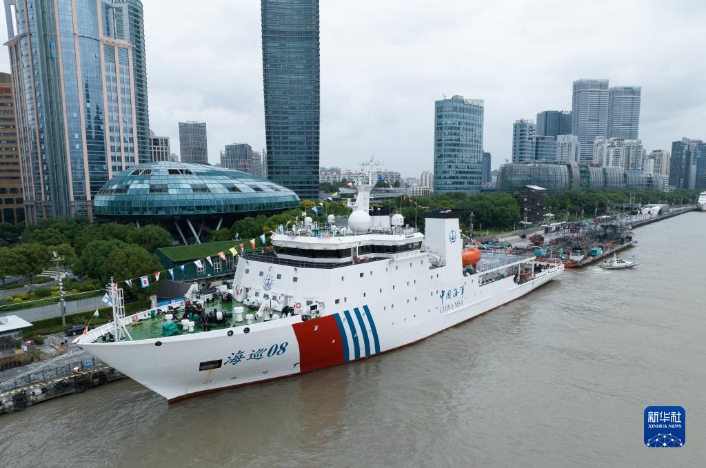 9月21日,“海巡08”輪靠泊在上海黃浦江邊(無人機照片)。