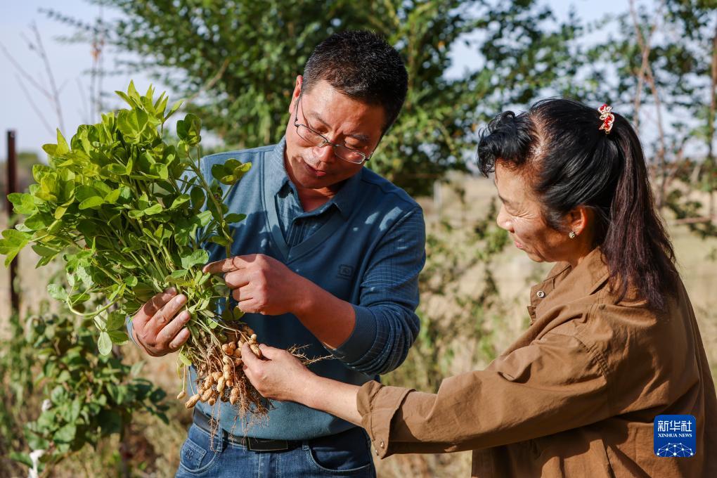 來自福建省南平市光澤縣農業農村局的援疆干部呂軍(左)與木壘縣三畦村農戶盛艷玲交流試種的花生生長情況(9月20日攝)。