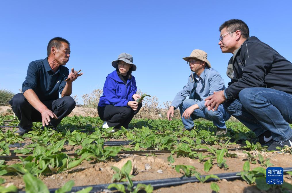 來自福建省南平市光澤縣農業農村局的援疆干部呂軍(右一)、來自福建省武夷山市經濟作物技術站的援疆干部黃文慶(右二)和來自福建省漳州市農業農村局的黃素英(左二),與新疆木壘生福生態農業發展有限公司負責人閆生福交流試種的大葉蛋白菊生長情況(9月20日攝)。