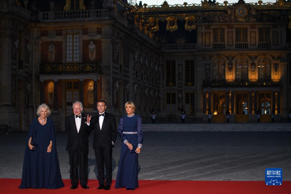 9月20日,在法國巴黎近郊的凡爾賽宮,法國總統馬克龍(右二)和夫人布麗吉特·馬克龍(右一)迎接前來出席國宴的英國國王查爾斯三世(左二)和王后卡米拉。