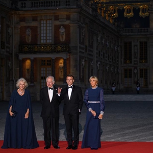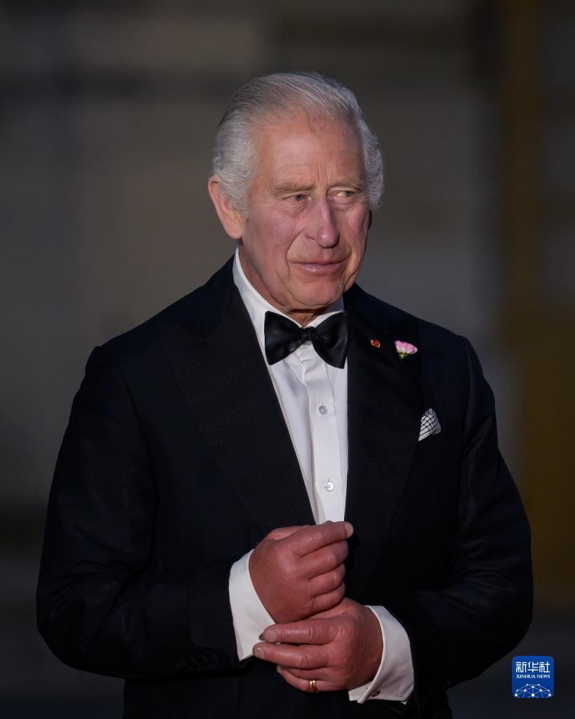 9月20日,在法國巴黎近郊的凡爾賽宮,英國國王查爾斯三世抵達國宴現場。