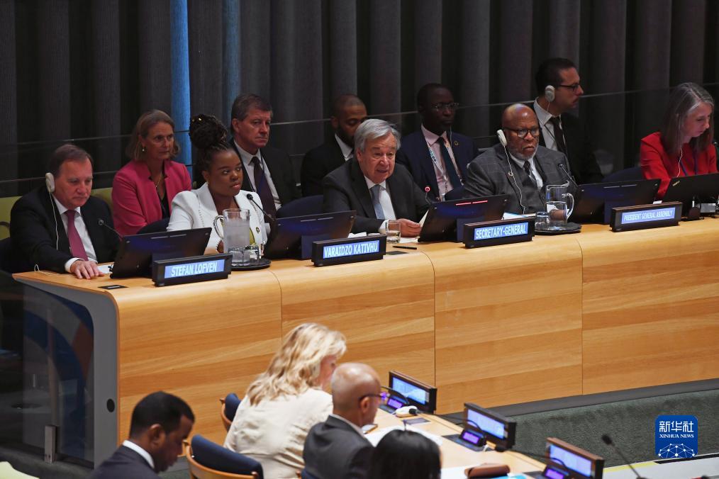 9月21日,在位于紐約的聯合國總部,聯合國秘書長古特雷斯(中)在未來峰會部長級籌備會上講話。