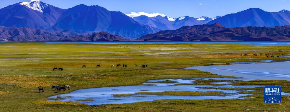 鳥瞰班公湖畔的濕地(無人機照片,9月21日攝)。