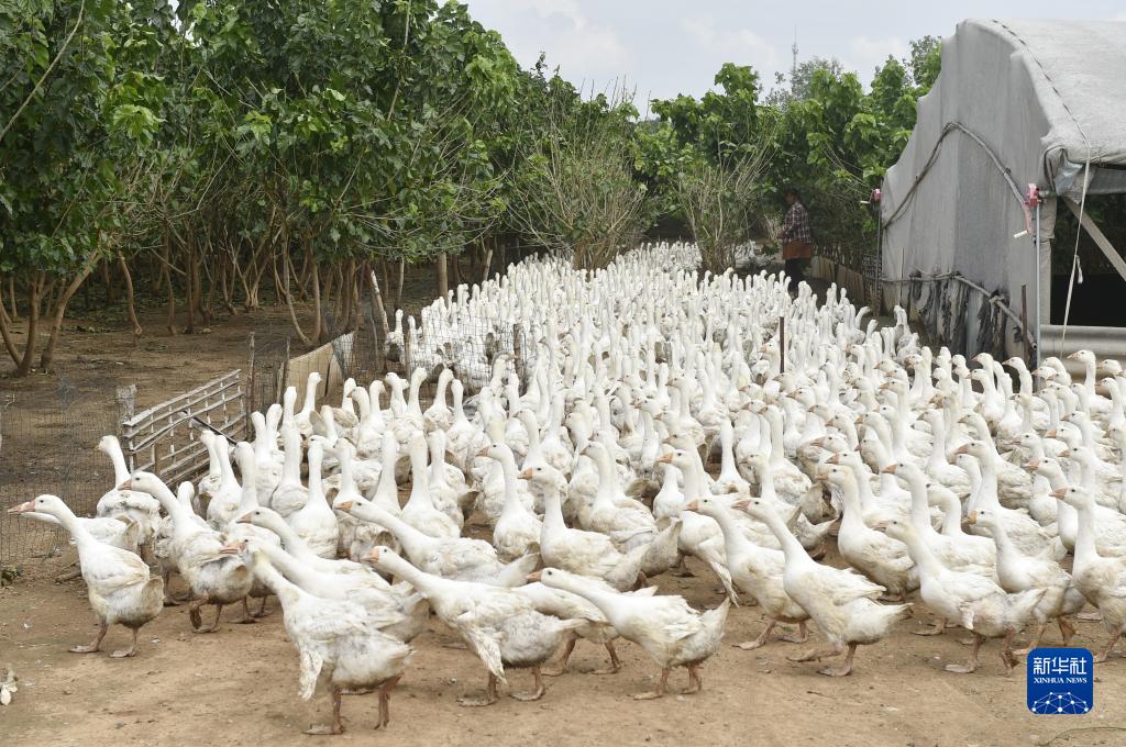 9月21日,在汝州市焦村鎮一家生態養殖家庭農場,工作人員在桑樹下散養白鵝。