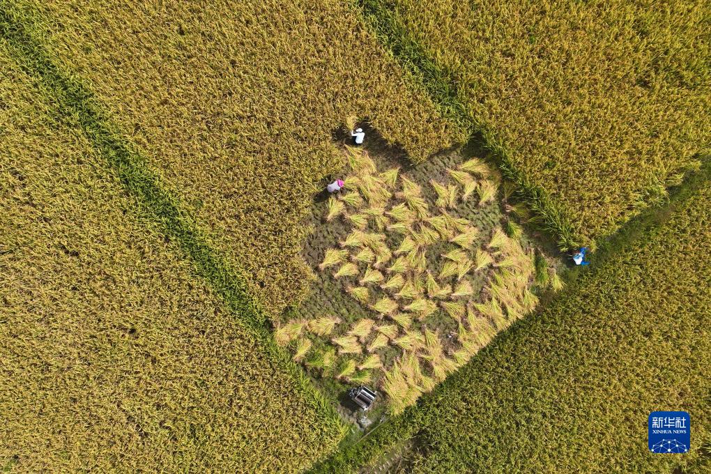 9月19日,重慶市黔江區馬喇鎮杉樹村村民在收獲貢米稻谷(無人機照片)。