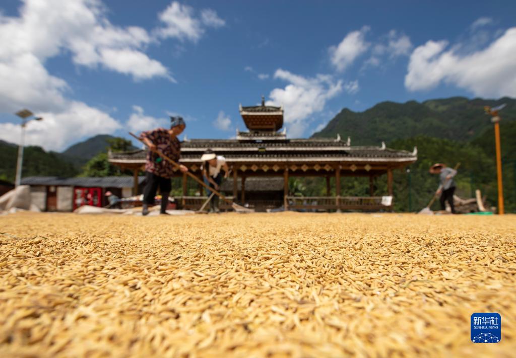 9月16日,村民在貴州省黔東南苗族侗族自治州從江縣剛邊壯族鄉三聯村晾曬稻谷。