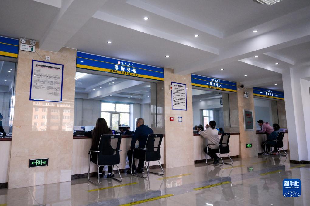 9月21日,在滿洲里站國際聯運貨物交接所營業廳,貨運代理公司工作人員在辦理中俄鐵路貨運業務。