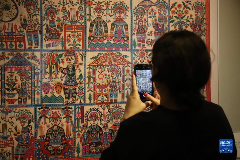 9月21日,一名參觀者在日本東京舉行的庫淑蘭剪紙藝術展預展上拍照。