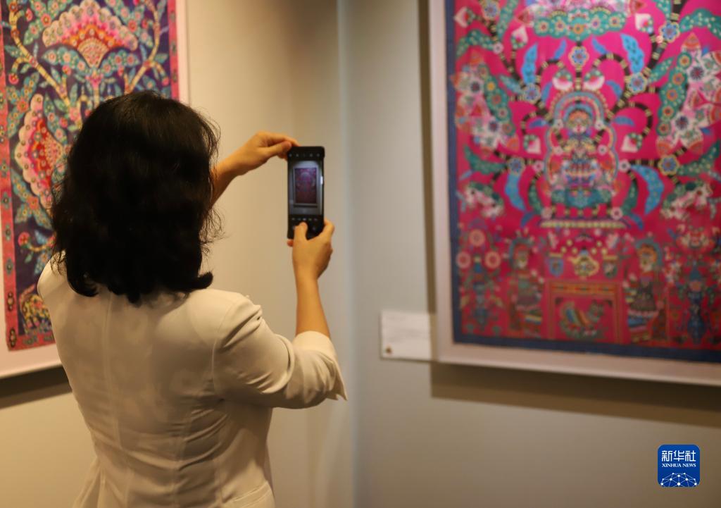 9月21日,一名參觀者在日本東京舉行的庫淑蘭剪紙藝術展預展上拍照。