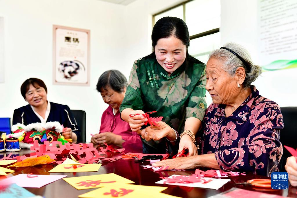 9月22日,在鄆城縣鄆州街道王沙灣社區日間照料中心,老人在學習剪紙。