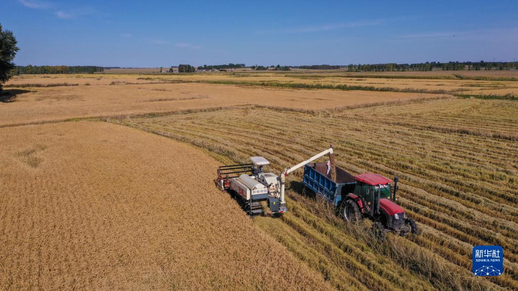 9月22日,在吉林省長春市九臺區龍嘉農樂種植家庭農場,農民駕駛農機收割水稻(無人機照片)。
