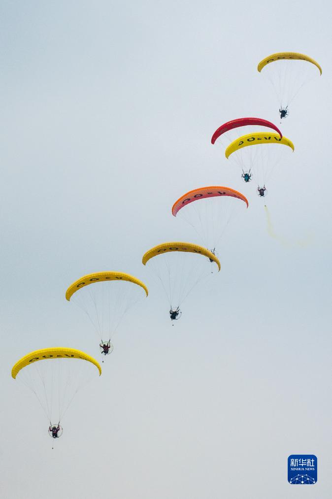9月22日,在湖南株洲蘆淞機場,動力傘飛行隊隊員進行飛行表演。