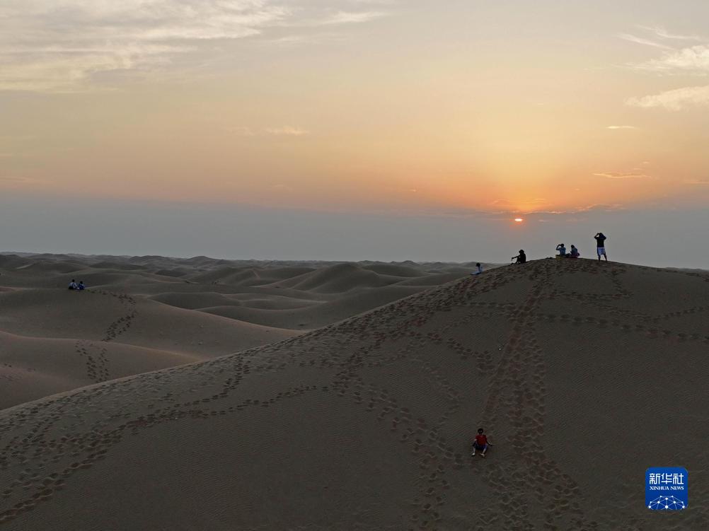 游客在中衛市沙坡頭景區沙漠游玩(9月6日攝,無人機照片)。
