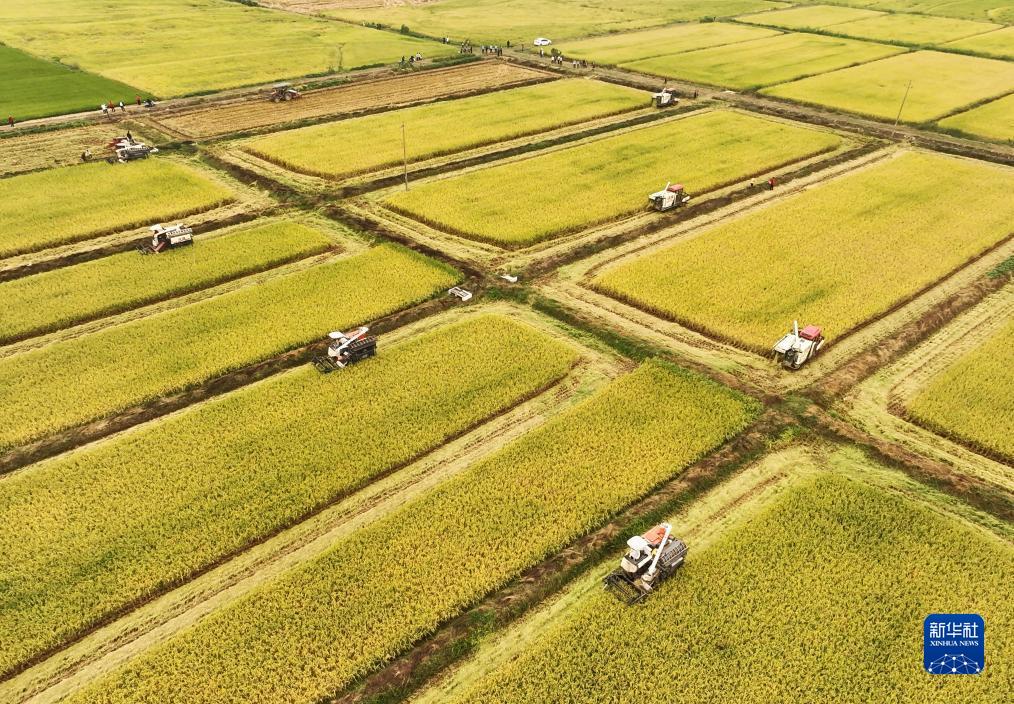 9月23日,在湖南省衡陽市衡陽縣庫宗橋鎮,農機手駕駛農機在收割稻谷(無人機照片)。