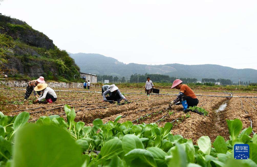 9月23日,湖南省永州市江永縣瀟浦鎮下界頭村,農民在移栽包菜苗。