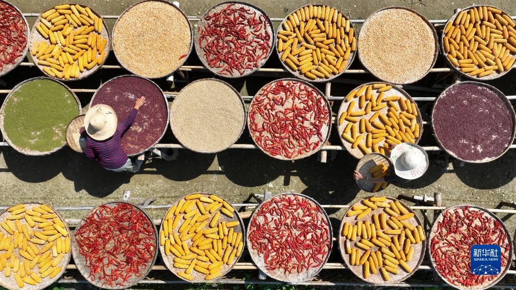 金秋時節,在安徽省黃山市徽州區呈坎村及黃山市歙縣深渡鎮陽產村,“曬秋”成為秋天里一道靚麗的風景?!皶袂铩笔峭钅系貐^的傳統習俗,由于氣候潮濕,當地村民利用晴好天氣,將收獲的農作物集中晾曬。五顏六色的農作物被拼成精美的圖案,慶祝豐收的同時,也成為當地特色景觀,吸引不少游客前來觀賞。