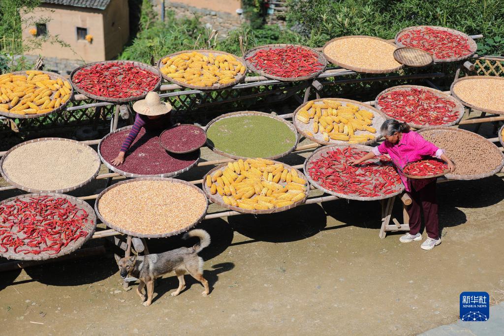 9月18日,在黃山市歙縣陽產村,村民在曬場上晾曬農作物。
