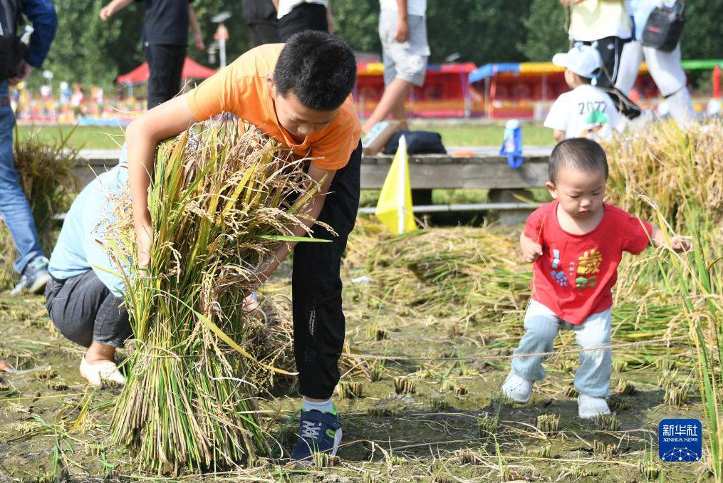 9月23日,在北京市海淀區上莊鎮西馬坊京西稻田,小朋友在活動中參加割稻子比賽。
