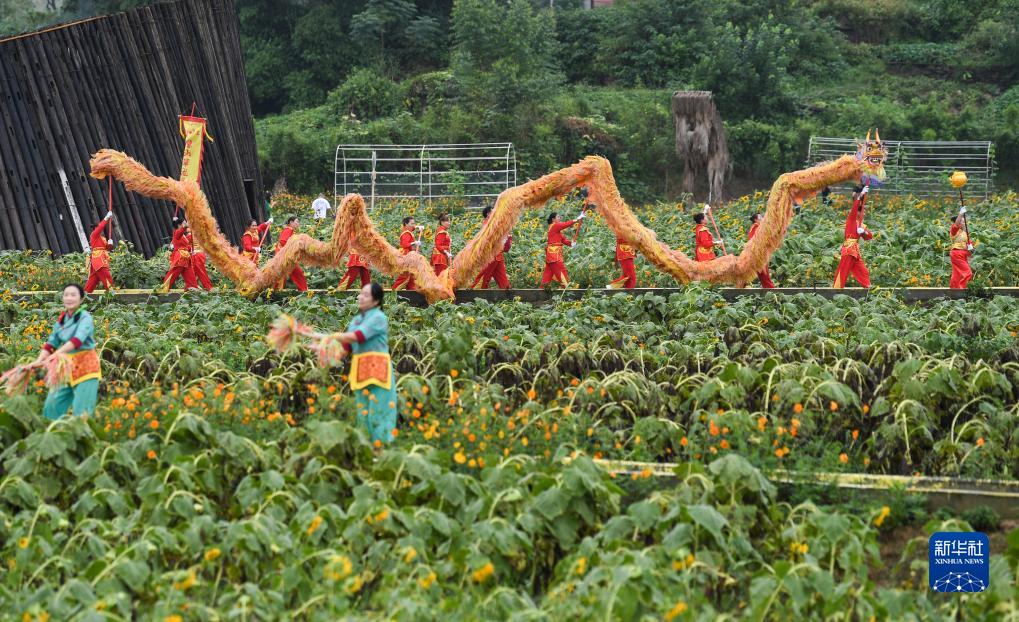 這是9月23日在重慶市璧山區七塘鎮將軍村拍攝的田間民俗表演。