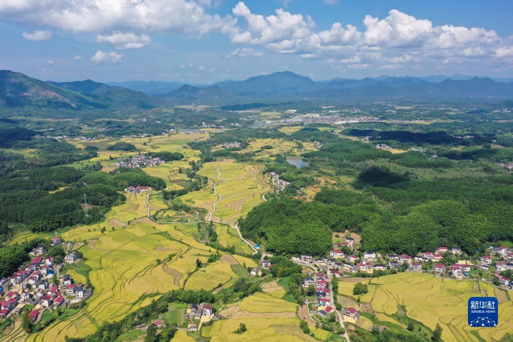 金秋時節,皖南山區安徽省宣城市旌德縣白地鎮梯田喜獲豐收。金黃的梯田與連綿的群山、錯落的民居相互映襯,勾勒出一幅優美的豐收畫卷。