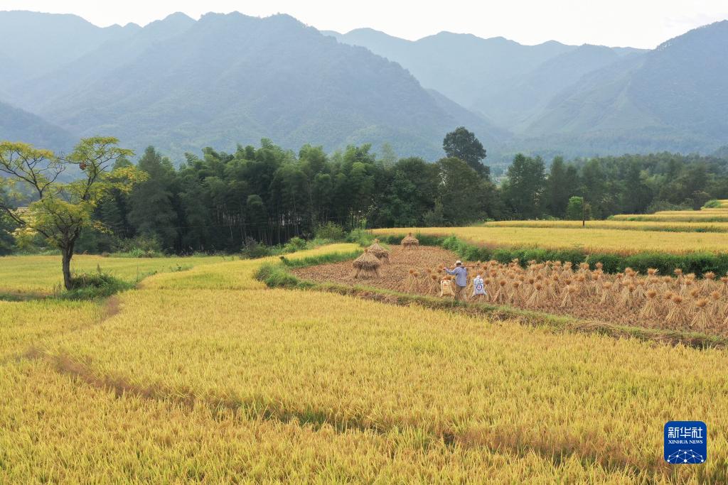 金秋時節,皖南山區安徽省宣城市旌德縣白地鎮梯田喜獲豐收。金黃的梯田與連綿的群山、錯落的民居相互映襯,勾勒出一幅優美的豐收畫卷。