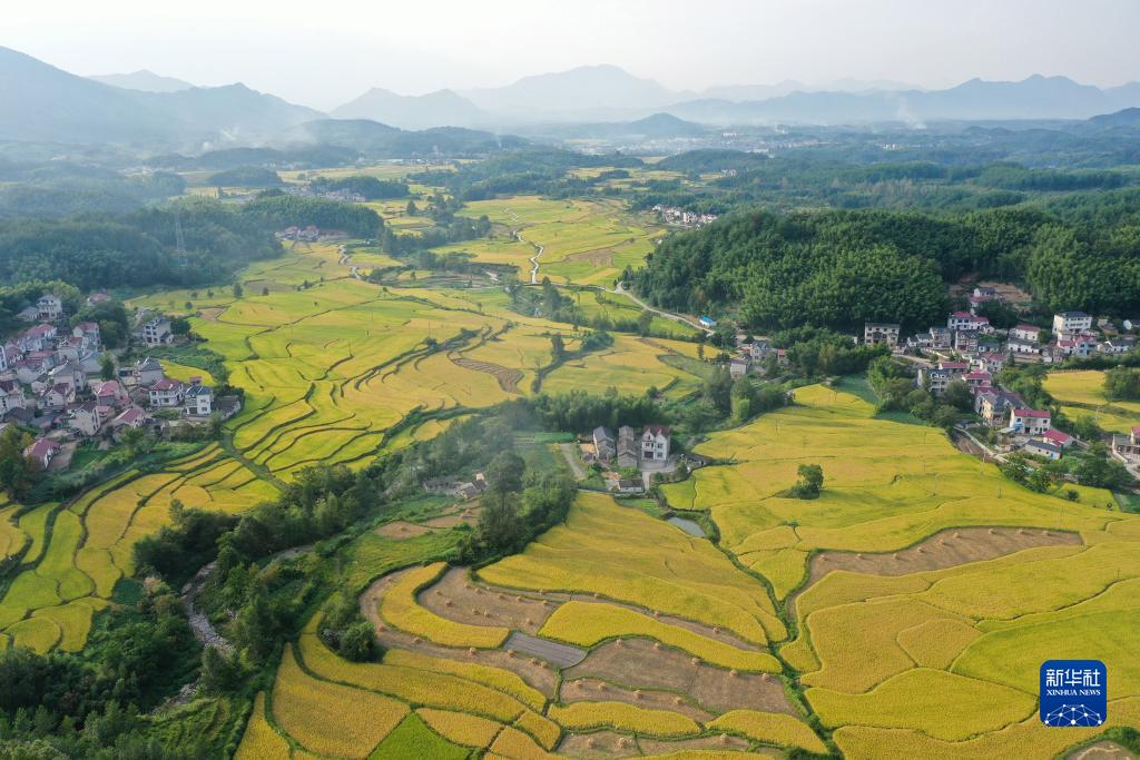 金秋時節,皖南山區安徽省宣城市旌德縣白地鎮梯田喜獲豐收。金黃的梯田與連綿的群山、錯落的民居相互映襯,勾勒出一幅優美的豐收畫卷。