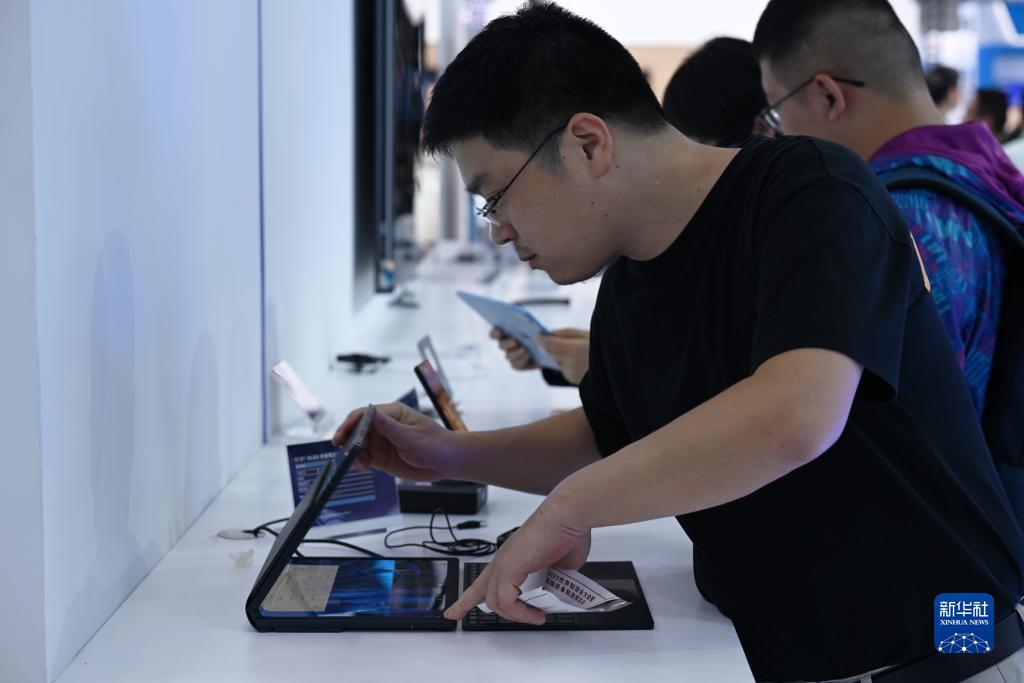9月22日,觀眾在2023世界制造業大會集成電路與新型顯示展區體驗一款OLED折疊筆記本。