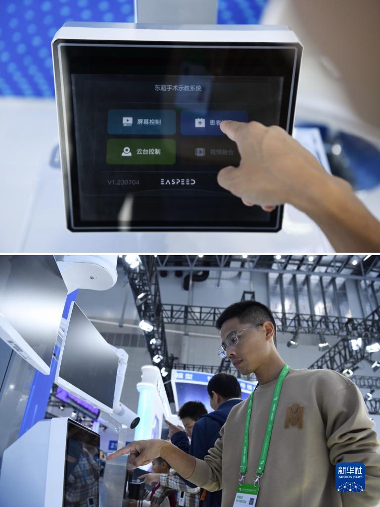 拼版照片:在2023世界制造業大會上,工作人員在演示一款基于“可交互空中成像”技術的非接觸式智慧醫療系統,工作人員無需接觸屏幕,便可直接于空中完成操控(9月23日攝)。