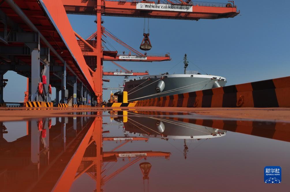9月16日,一艘輪船靠泊在唐山港曹妃甸港區礦石碼頭卸載(無人機照片)。