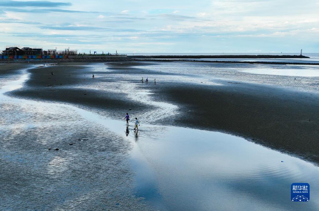 9月16日,游客在江蘇省啟東市“十里海灣”灘涂上游玩(無人機照片)。