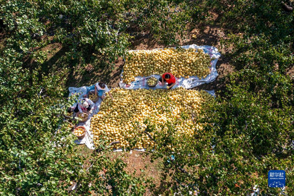 9月20日,安徽省宿州市碭山縣園藝場工人在分揀剛采摘的碭山酥梨(無人機照片)。