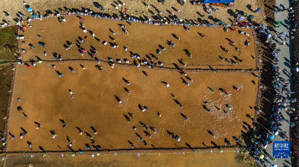 9月23日,在昆明市東川區烏龍鎮,農民參與豐收節活動(無人機照片)。