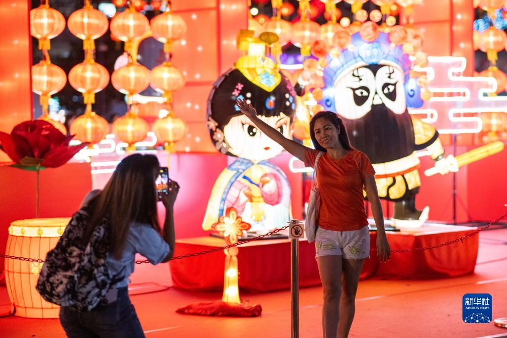 9月23日,人們在香港維多利亞公園舉行的中秋彩燈會上拍照。