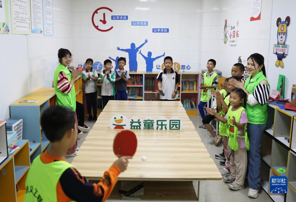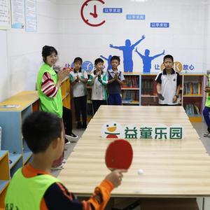 9月23日,在赤水市市中街道濱西社區益童樂園,孩子們在“童伴媽媽”陪伴下打乒乓球。