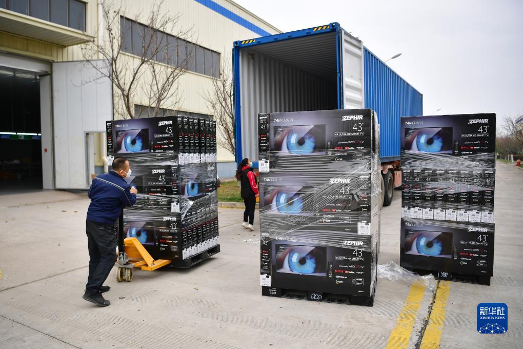 在西安國際港站附近的一家顯示器生產企業內,工人在裝箱產品,準備發貨(2022年3月17日攝)。