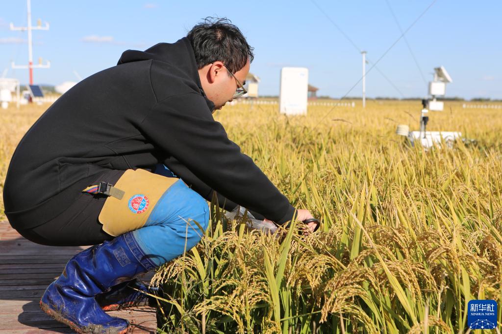 在富錦市現代農業萬畝水稻科技示范園實驗基地,氣象員李辰暉采集水稻樣本(9月22日攝)。