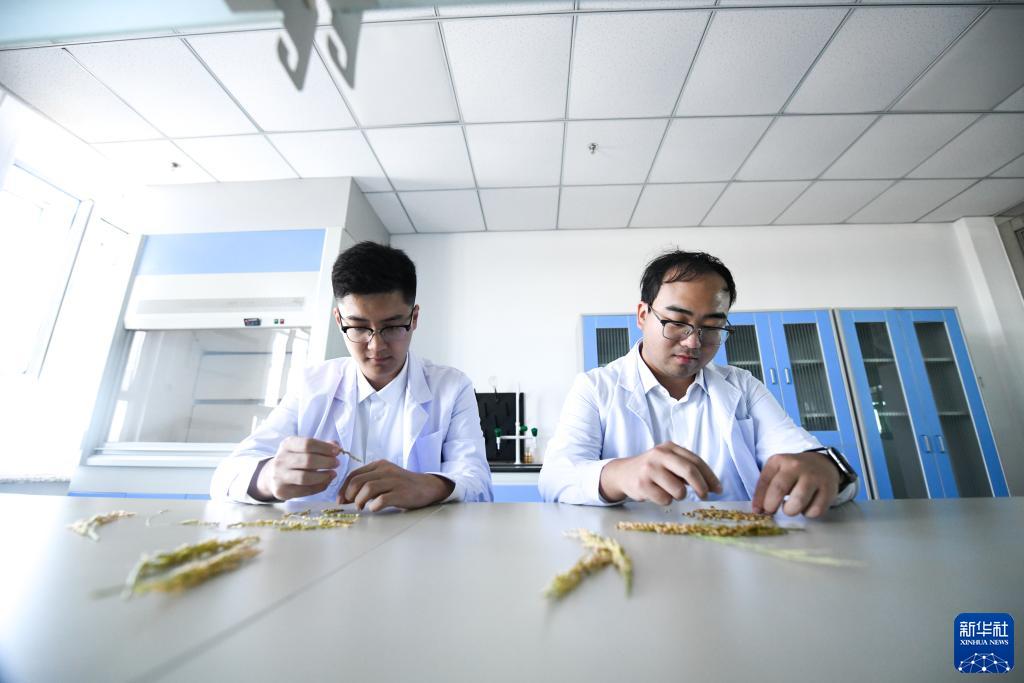 在富錦市現代農業萬畝水稻科技示范園實驗基地,氣象員李辰暉(右)與王國泰在分離稻粒以進行水稻灌漿速率試驗(9月22日攝)。
