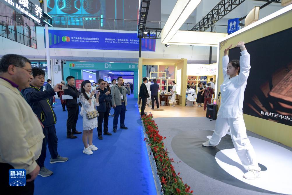 9月22日,觀眾在第六屆中國-阿拉伯國家博覽會醫療康養展區觀看健身功法。