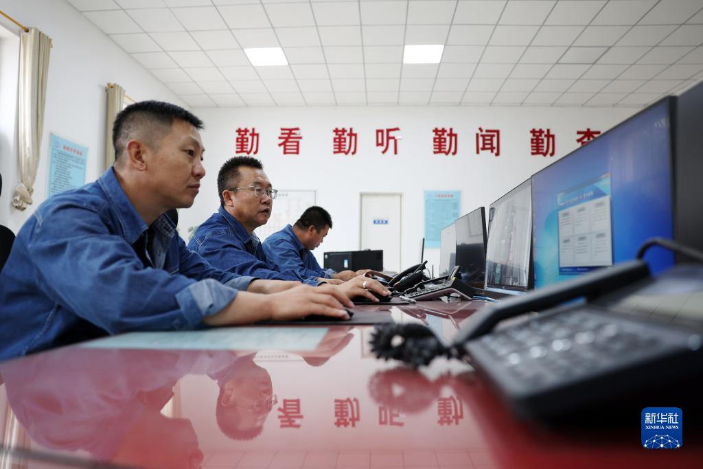 寧夏紅寺堡揚水管理處紅三泵站副站長趙金柱(中)在中控室與同事監控各項數據(9月7日攝)。