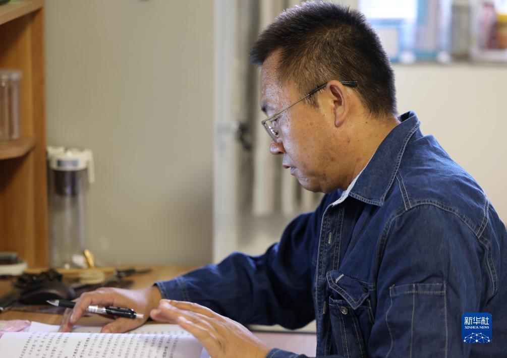 寧夏紅寺堡揚水管理處紅三泵站副站長趙金柱在泵站宿舍整理材料(9月7日攝)。