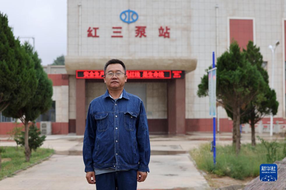 寧夏紅寺堡揚水管理處紅三泵站副站長趙金柱在泵站機房前留影(9月7日攝)。