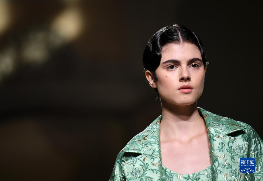 9月24日,模特在意大利米蘭時裝周上展示含有貴州苗繡元素的設計時裝。