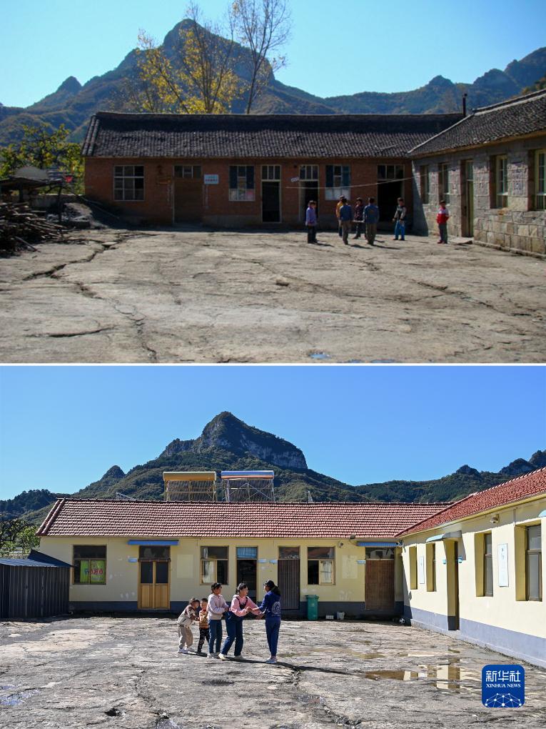 拼版照片:上圖為2009年10月14日拍攝的馬武寨寄宿制小學一角(新華社發);下圖為2023年9月20日拍攝的馬武寨寄宿制小學一角(新華社記者楊晨光攝)。新華社發